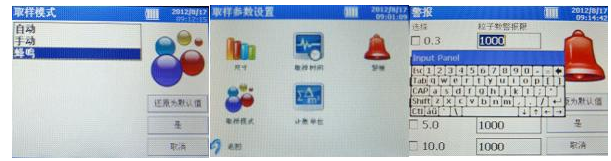 3、取樣時間設置:“設置”頁面選擇“取樣時間”,其中可以通過軟鍵盤修改取樣個數、取樣延時時間、取樣間隔時間、每次取樣時間或每次取樣體積,設置完畢后選擇“是”。