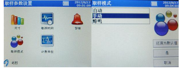 4、取樣模式設置:“設置”頁面中選擇“取樣模式”,其中可以設置自動模式、手動模式和蜂鳴模式。具體每個模式使用方法在后文詳述。
