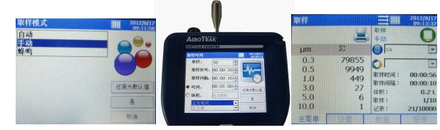 2、手動模式:“設置”頁面中選擇“取樣模式”,選擇“手動”。同樣進行取樣時間設置,手動設置中僅取樣延時時間、每次取樣時間或每次取樣體積的設置有效。返回主屏幕按啟動按鈕開始取樣,再次按啟動按鈕即停止測量。